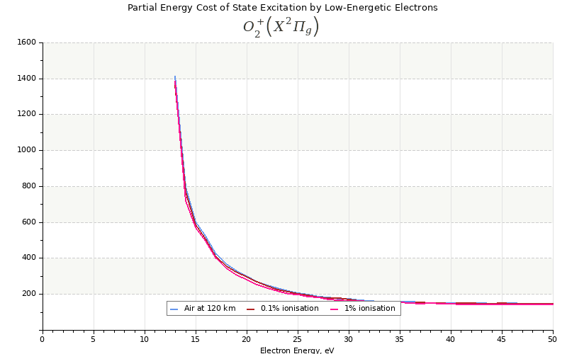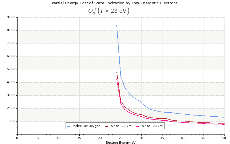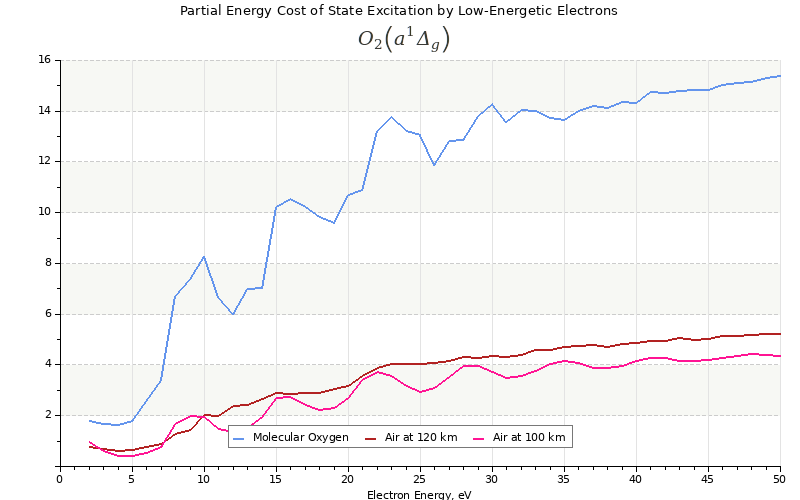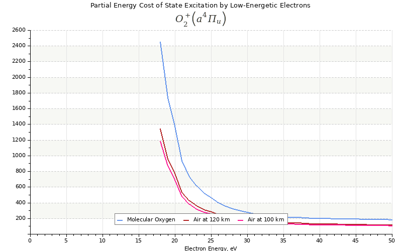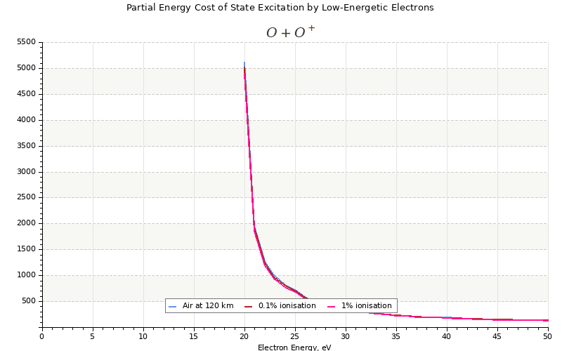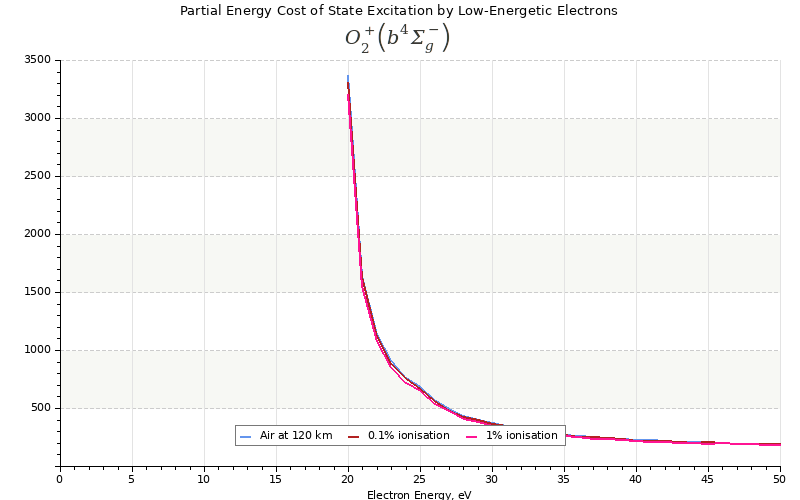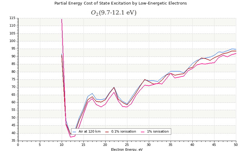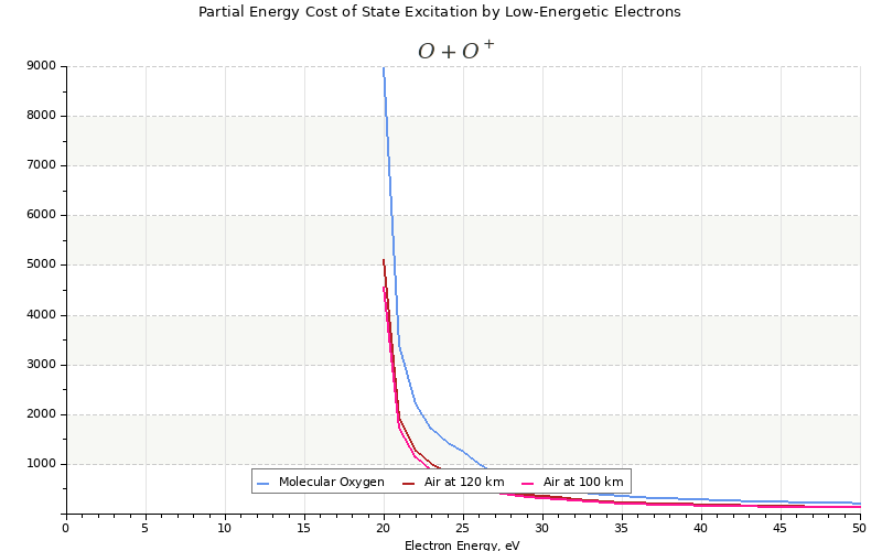 The costs for initial electron energies 100 eV, 1 keV and 10 keV were calculated for air at ~120 km (mixture of 70% N2, 10% O2 and 20% O).