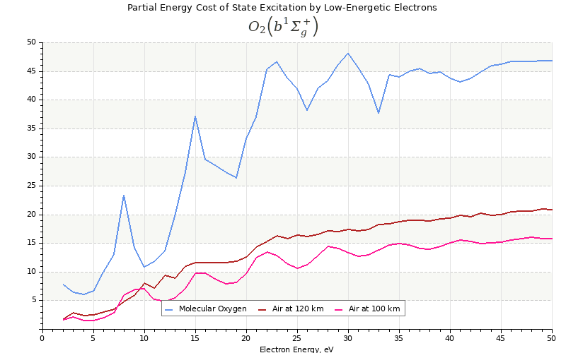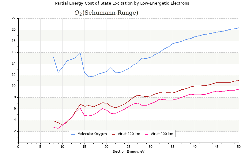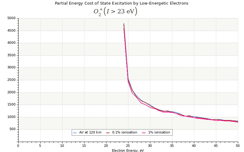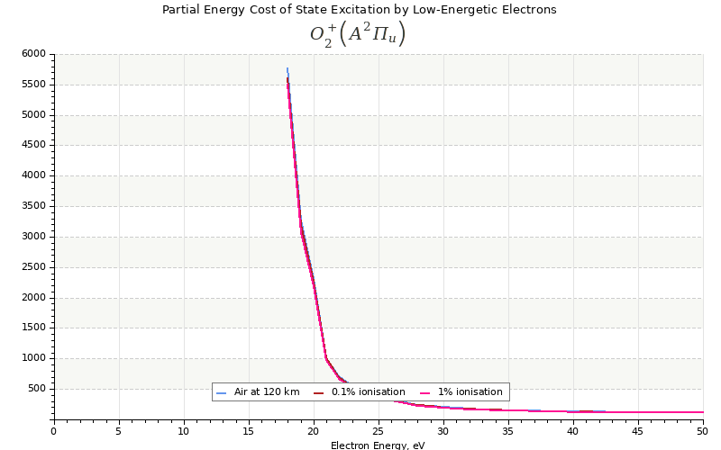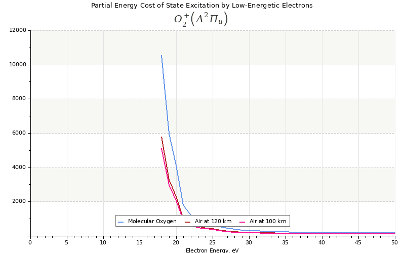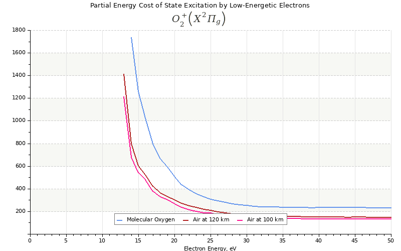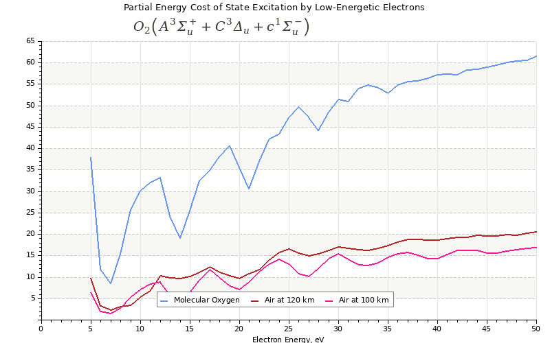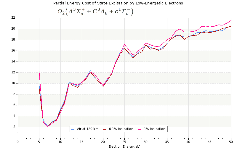 The costs for initial electron energies 100 eV, 1 keV and 10 keV were calculated for air at ~120 km (mixture of 70% N2, 10% O2 and 20% O).